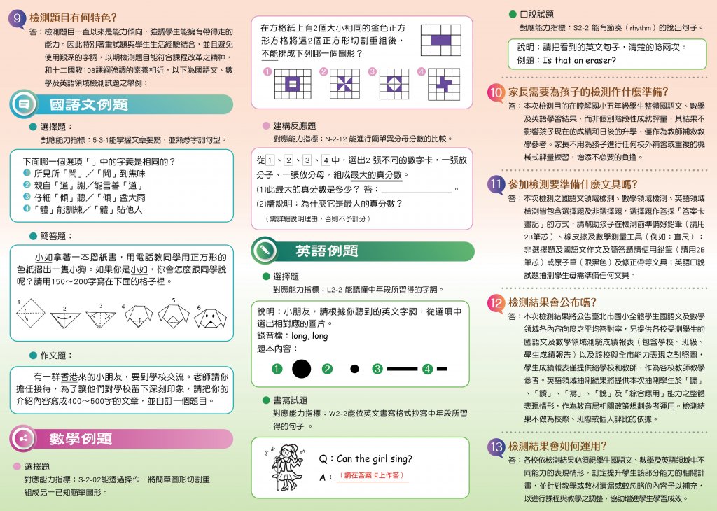 國語文(簡答、作文)及英語領域之抽測。