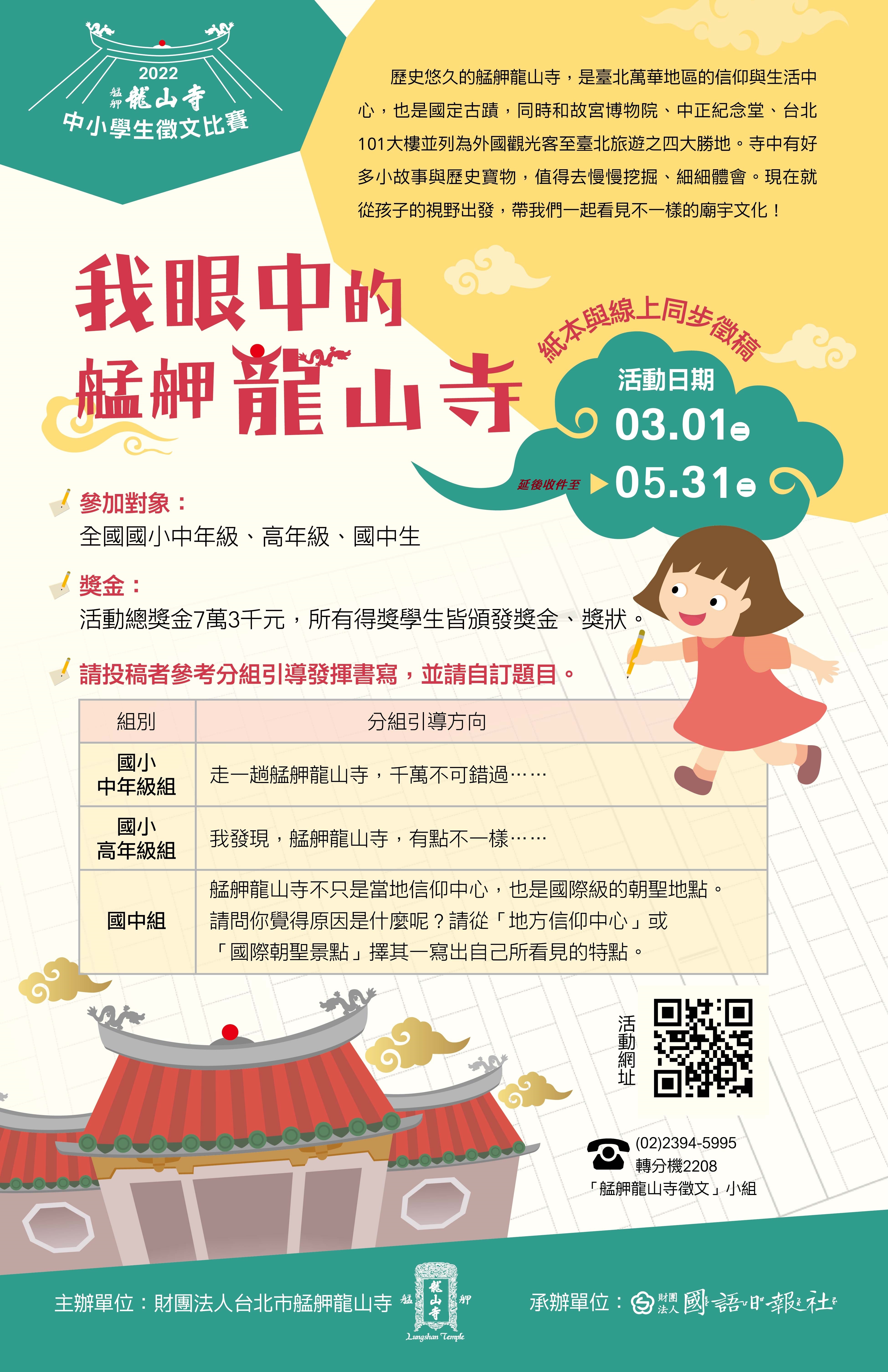 四、「2022艋舺龍山寺中小學生徵文比賽我眼中的艋舺龍山寺」活動網址https://bit.ly/320t70i 或洽活動專線 (02)2394-5995分機2208。