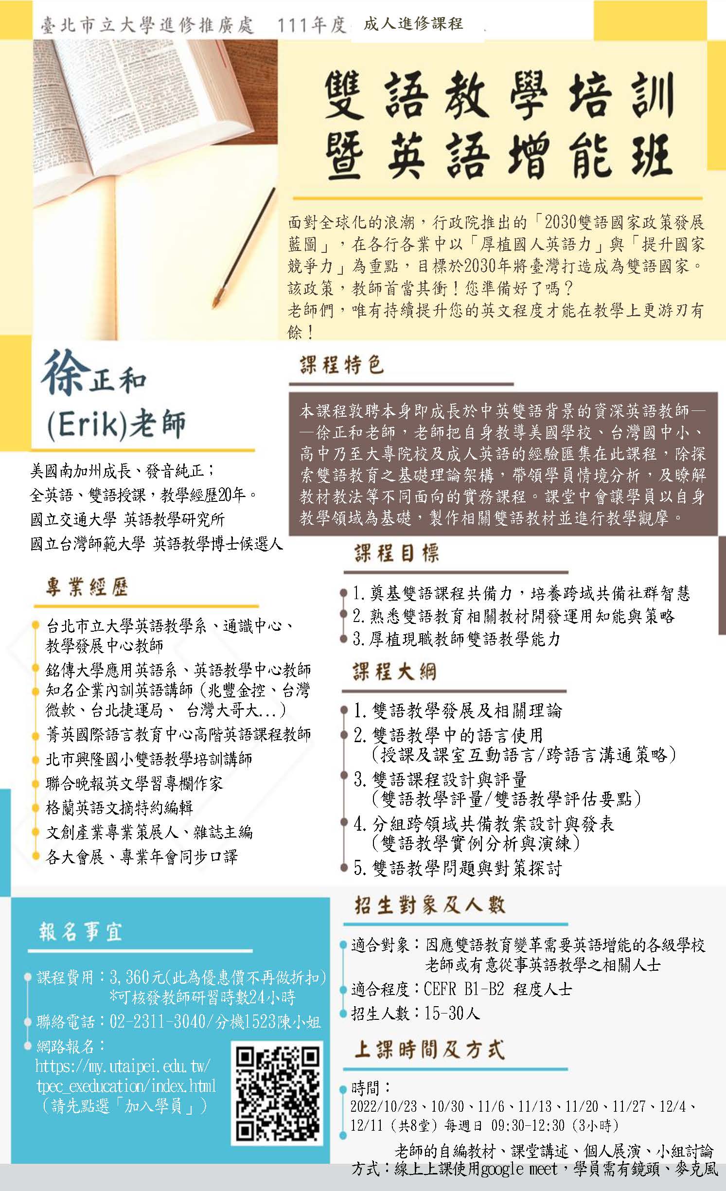 (七)網路報名:請至本處報名網頁報名(https://my. utaipei.edu.tw/tpec_exeducation/index.html)新學員請先於右上角「加入學員」,再於左欄點選「111-1 成 人進修-線上雙語教學培訓暨英語增能班」。