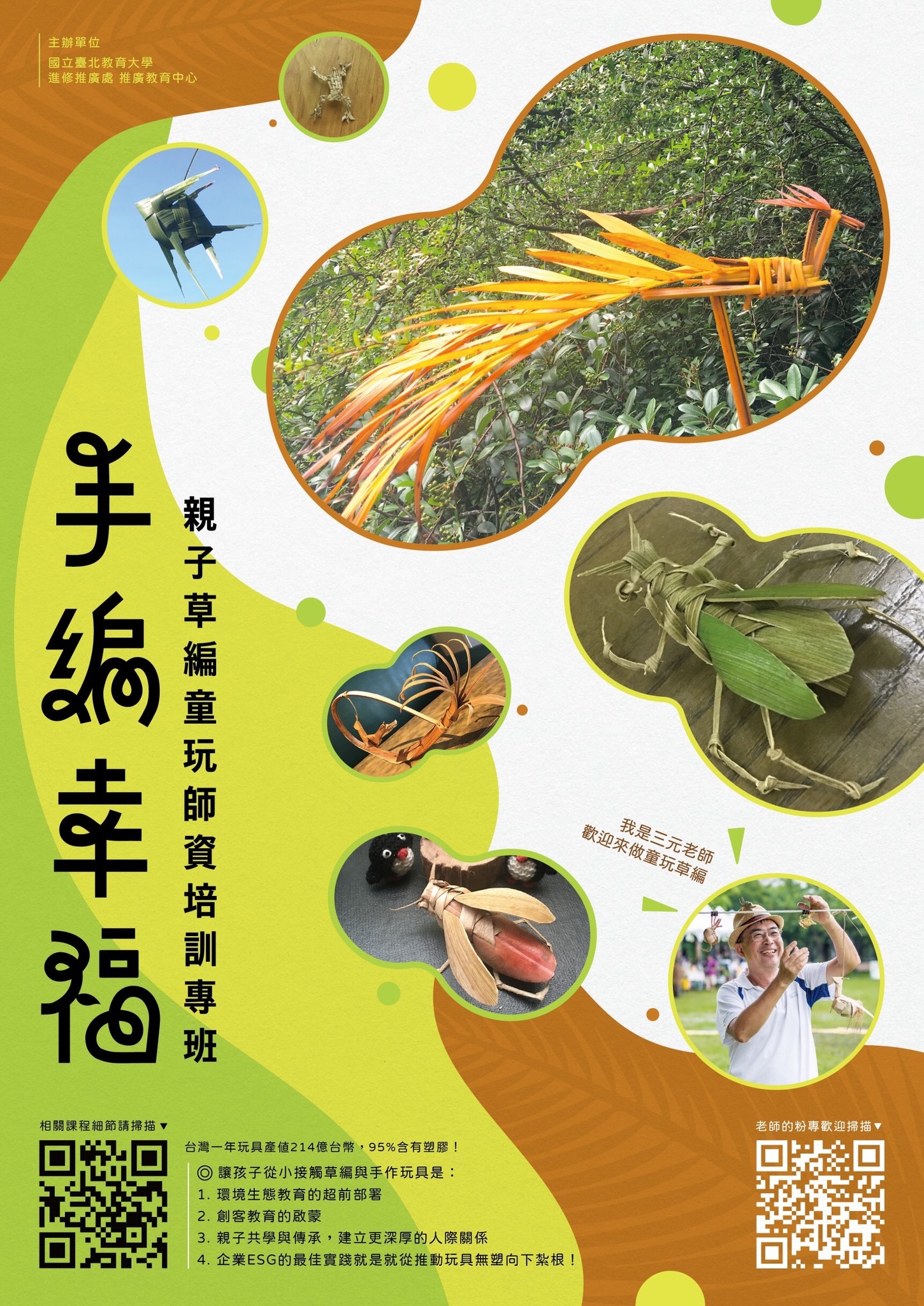 二、草編幸福-童玩技藝師資培訓(入門班):特聘專業草編達人 「草編CEO林三元老師」親授,課程包含戶外採集、戶外與 教室型態的教學示範、草編文化歷史理論介紹,豐富多樣的內容不藏私分享。課程時間為週六9:00-16:00(日期111 /11/12),共6小時。