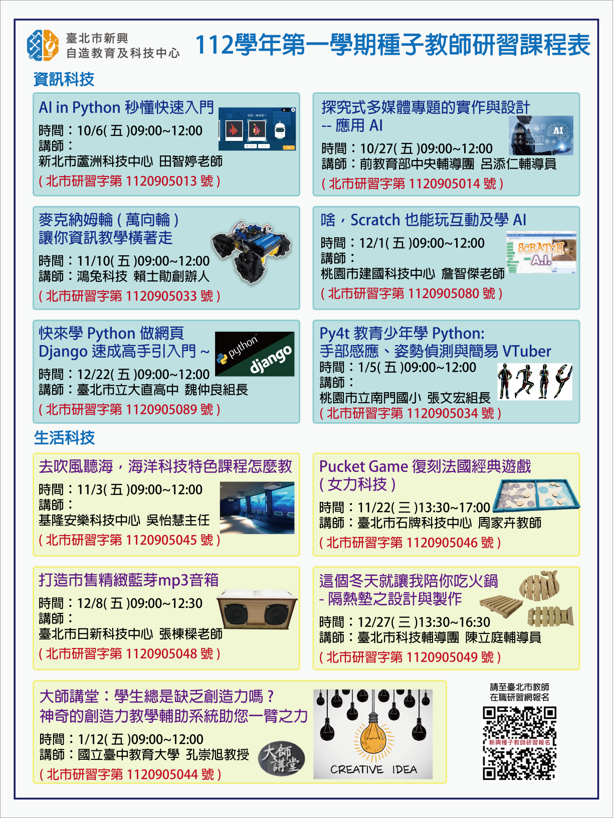 有關臺北市新興科技中心(主責中山區及內湖區),辦理 「112學年度第一學期科技教育教師培訓計畫」,請貴校 務必轉知科技領域教師並依研習類別推派教師各一名參 加 生科類、資科類培訓,請查照。
