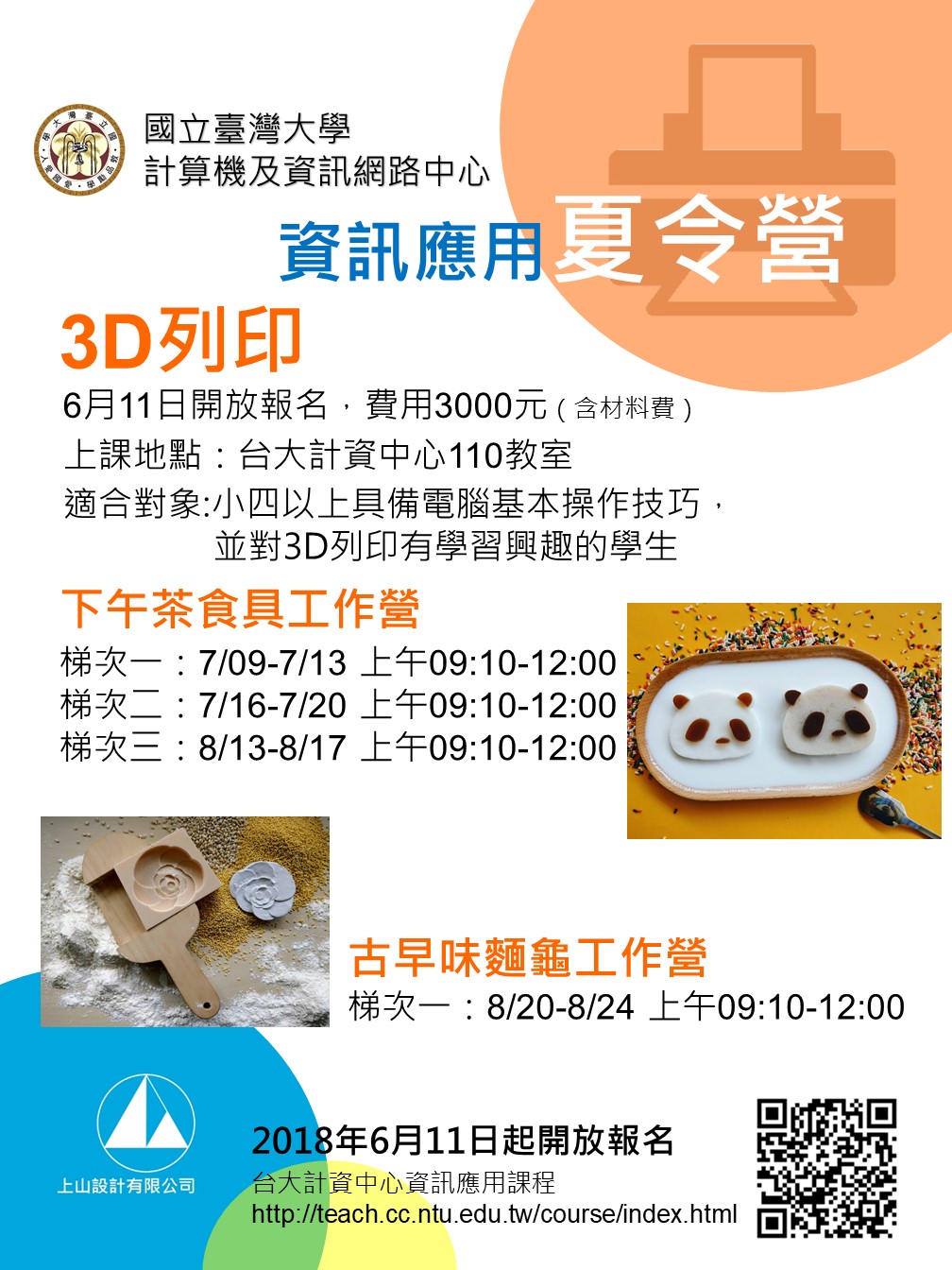 一、本校計資中心於107年7、8月間辦理資訊應用夏令營,詳細課程內容與報名連結請至該中心資訊應用課程網查詢http://teach.cc.ntu.edu.tw/course/index.html