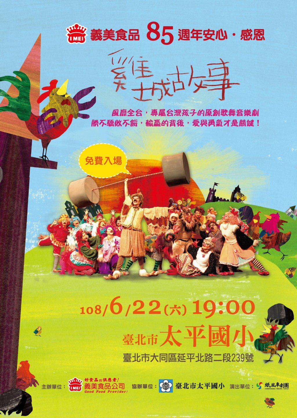 紙風車劇團將於6/22(六)19:00在台北市太平國小演出《雞城故事》,免費演出,自由入場。
