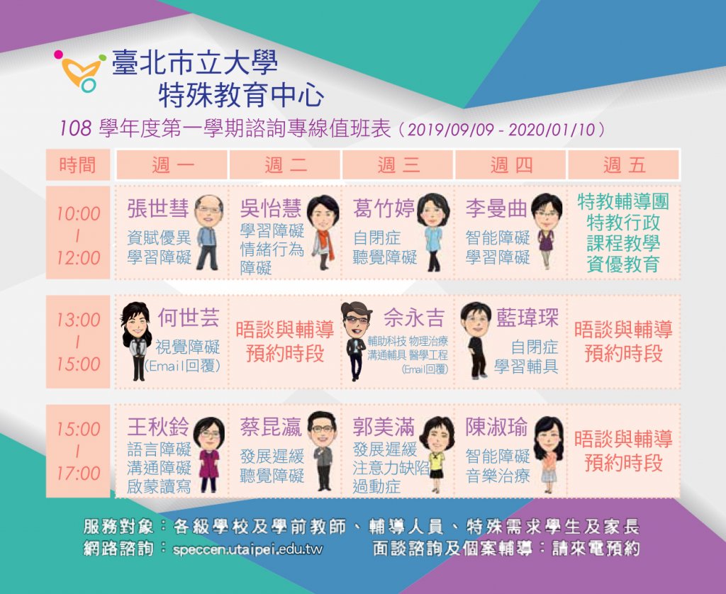 108學年度第1學期特殊教育諮詢專線輪值表及海報