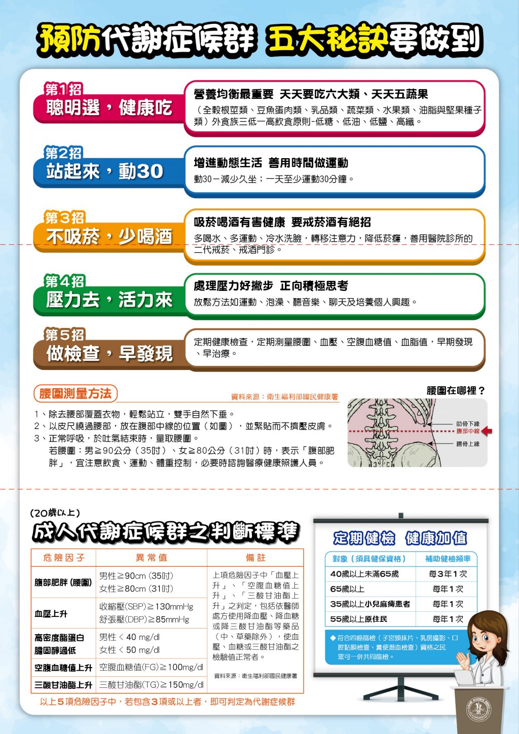 為讓學童及其家長學習正確量腰圍的方式並了解「代謝症候群」對身體 健康的危害,本局與本府教育局特辦理旨揭學習單活動,學習單內容包 括:代謝症候群判斷標準、預防代謝症候群之五大祕訣、腰圍量測方式 圖解、「健康護腰」是非問答及家人腰圍量測記錄等,發放對象為就讀 本市國小4-5年級學童(每位學童一份衛教單張及腰圍量測尺),於期 限內完成線上(https://goo.gl/forms/VgzjVjxAf4eglQgn2)學習單填 寫即可參與抽獎