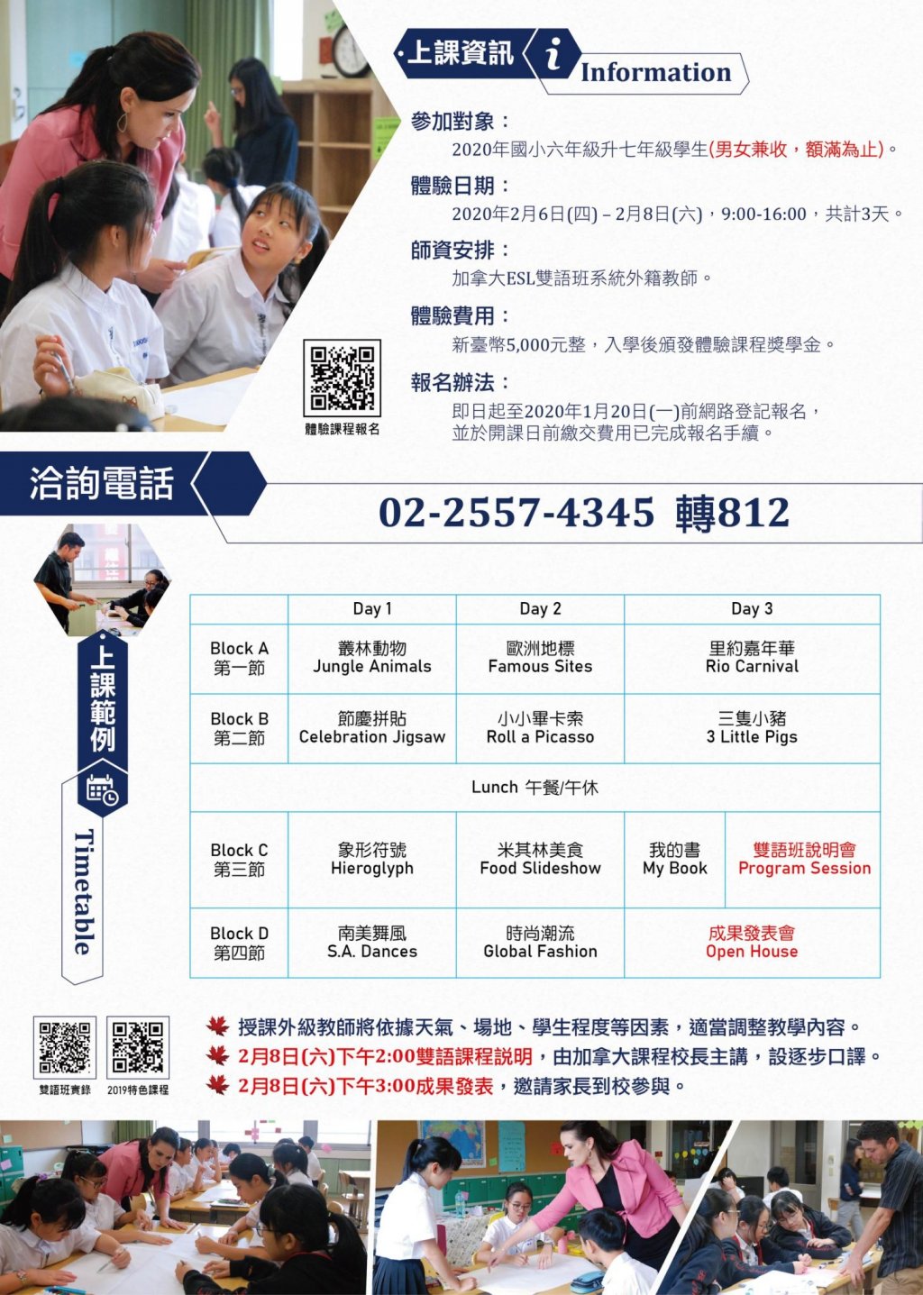 主旨:懇請貴校轉知靜修國中部2020年寒假加拿大ESL雙語班體 驗課程訊息,請查照。 說明:靜修國中於2020年2月6日至8日,辦理國小六年級學生之加 拿大ESL雙語班體驗課程,敬請貴校協助公告於學校網頁。 實體海報與傳單以聯絡箱方式傳送,請協助張貼訊息並轉 知家長會。