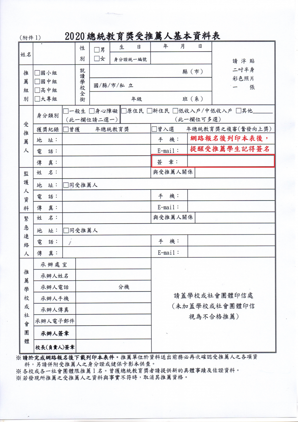 (二)2020總統教育獎推薦資料表。(網路報名後列印)