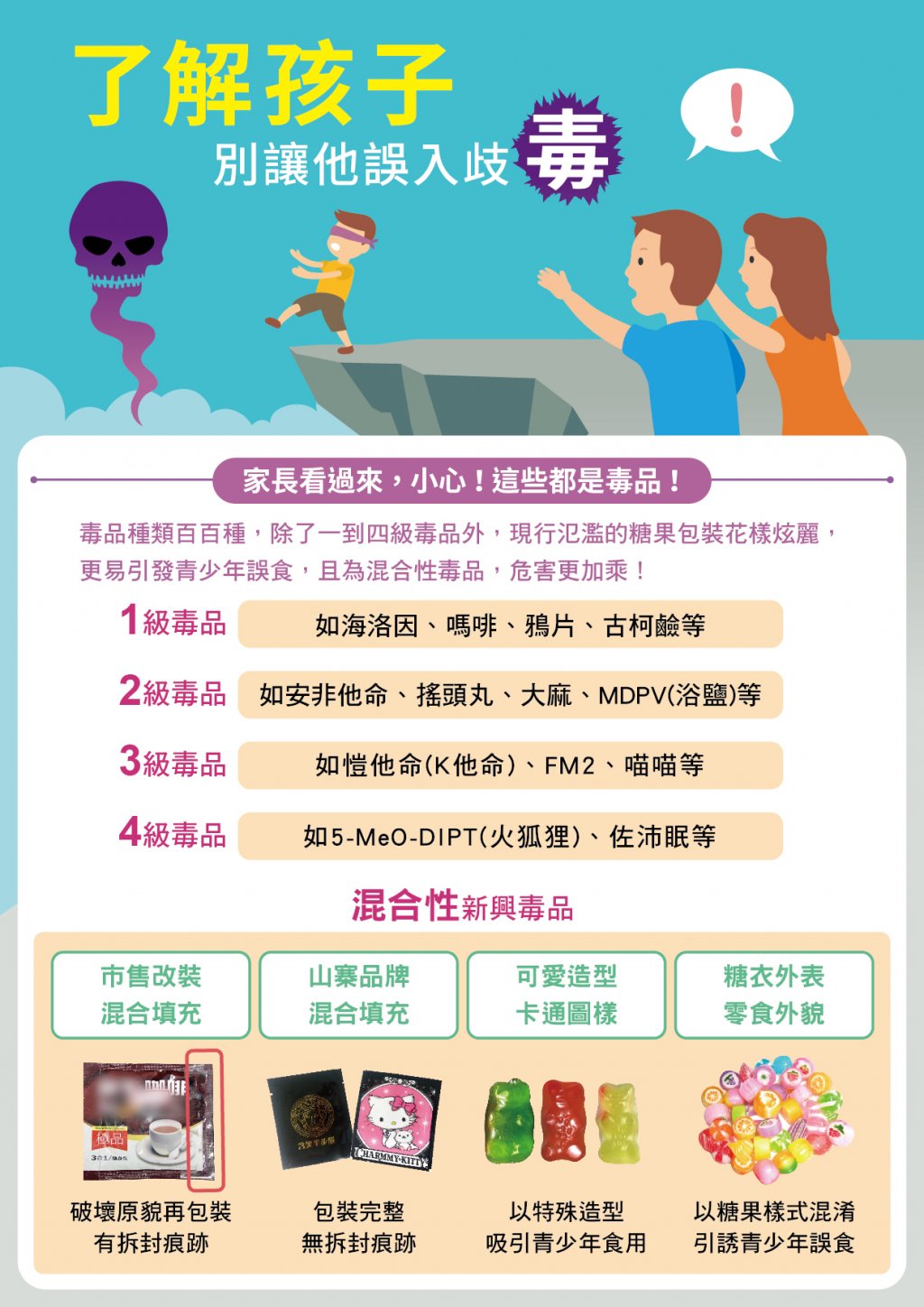 毒品種類百百種,糖果花俏包裝更容易引起青少年誤食。