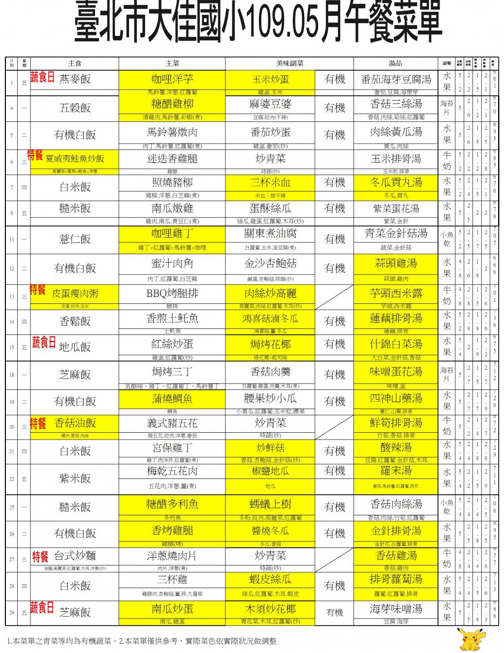 109年5月營養午餐菜單