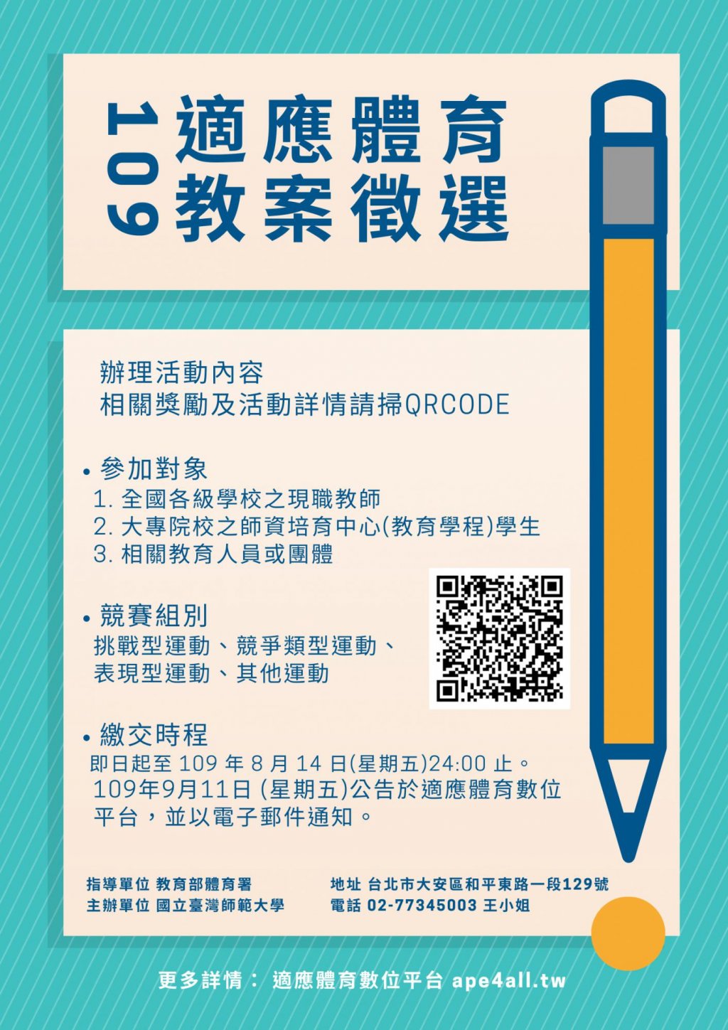 三、相關評選方式及其他資訊詳見附件說明,並可洽詢聯絡 人:國立臺灣師範大學專任助理王奎藺,電話:02- 77495003。
