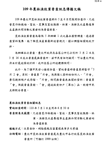 「109年臺北市農林漁牧業普查」之普查訊息傳播