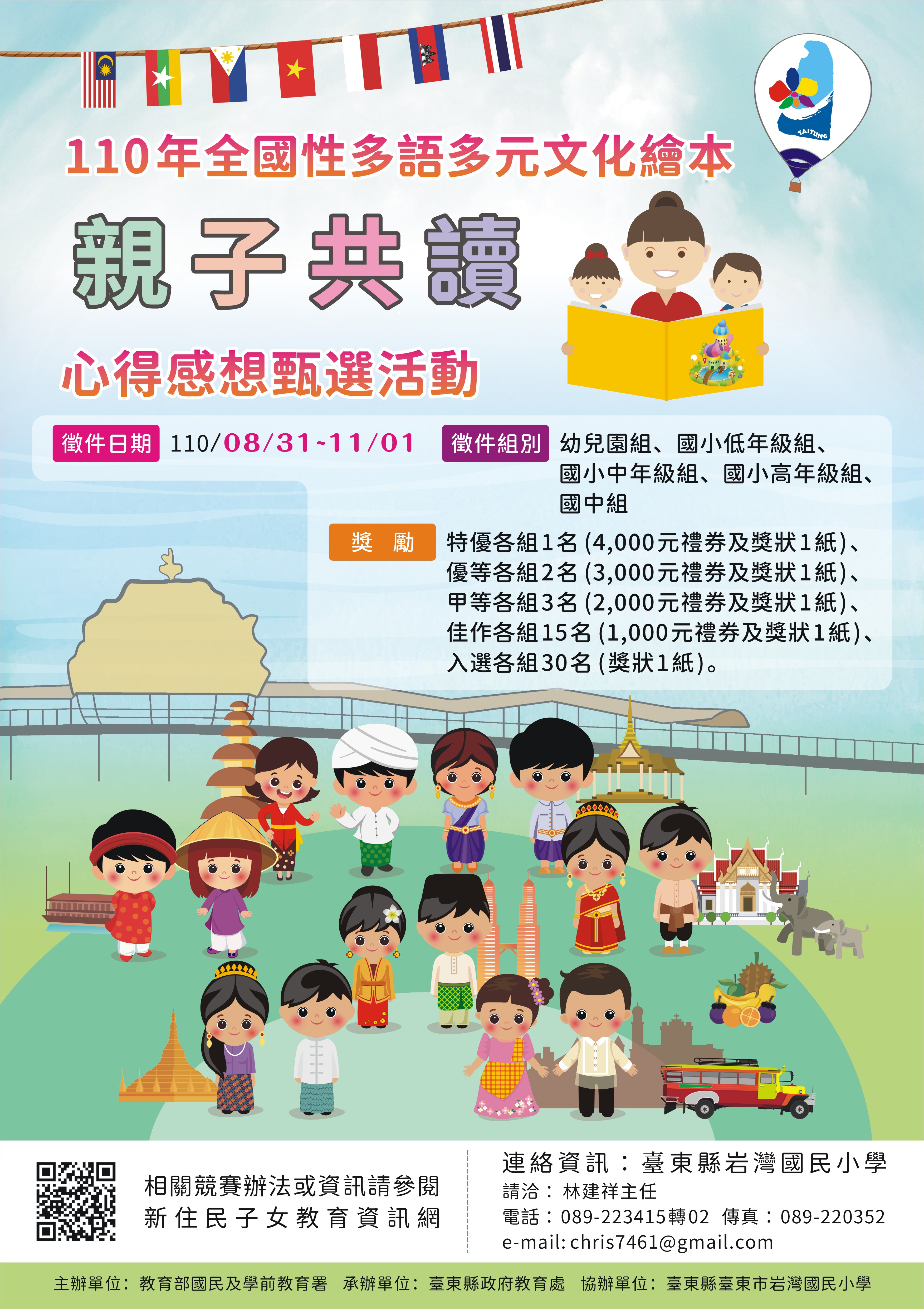 教育部委託臺東縣政府舉辦「全國性多語多元文化繪本親子共讀心得感想甄選」,收件時間延長至11/1 ,歡迎本校家長與學生參加!