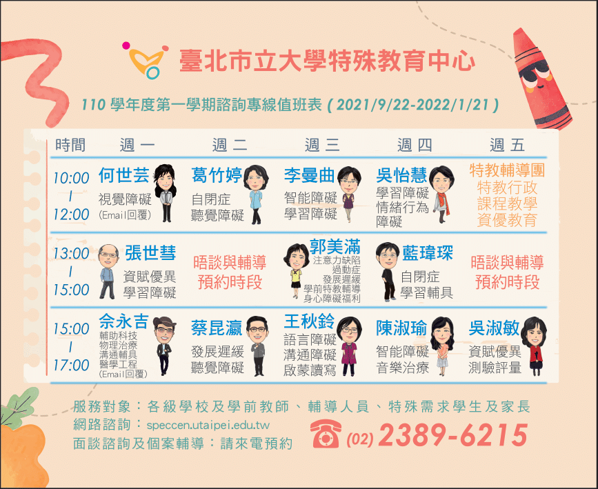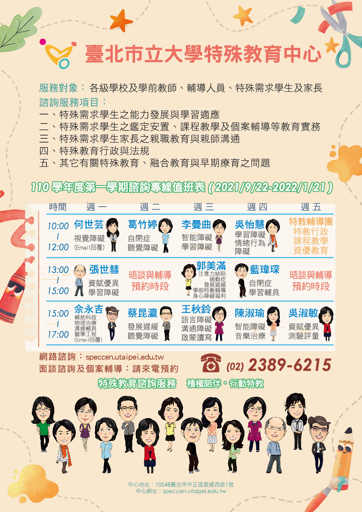 臺北市立大學特殊教育中心持續辦理「特殊教育諮詢專線」,提供給對特教生教養、學習輔導上有困擾或疑惑的家長及教師,歡迎善加利用。
