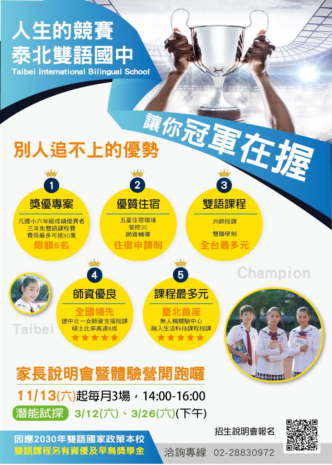 三、為了讓國小五六年級的學生與家長更能了解本校國中部的辦學精神,於110年11月13日起至111年3月26日(星期六) 止,辦理新生體驗營暨家長說明會。說明會報名方式可至 本校招生專網預約報名 (https://reurl.cc/Rb9gpe)或撥 打招生專線電話報名( 28830972、28825560分機 215、121)。為獎勵優秀學子,市長獎、議長獎入學者,高達50 萬元獎學金(限額,分期給付,第2學期起有續領條件)。