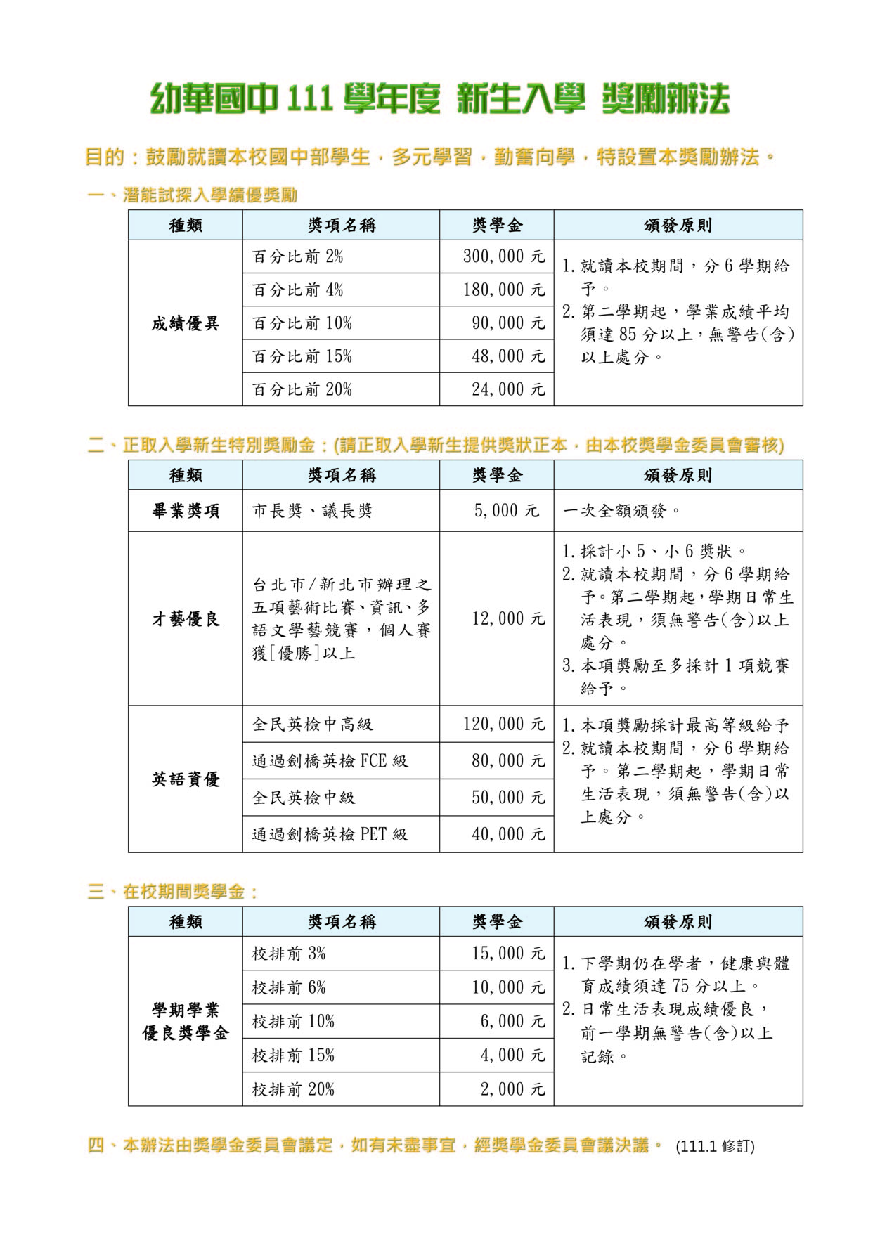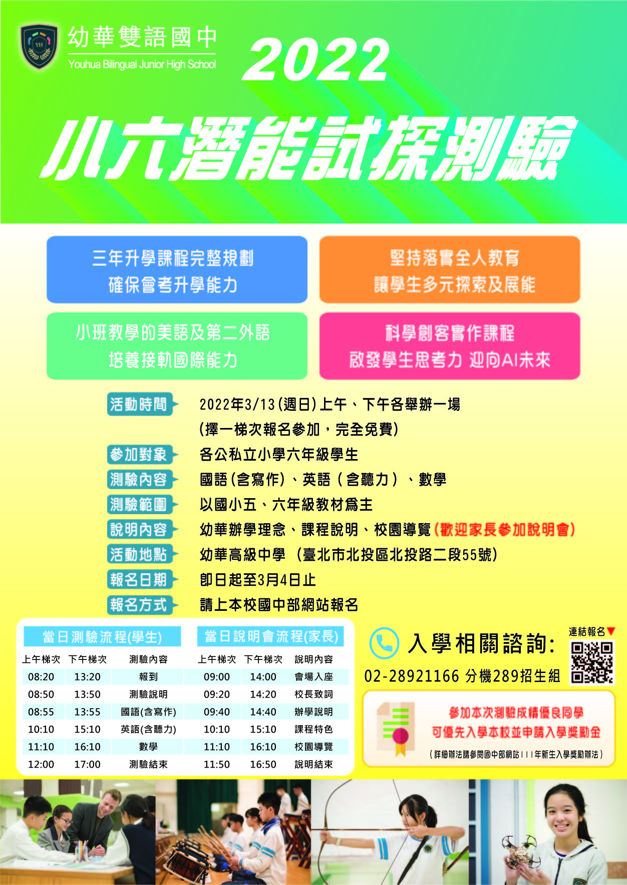 六、報名方式:請至幼華中學網頁 http://rpage.yh.tp.edu.tw/ 線上報名。