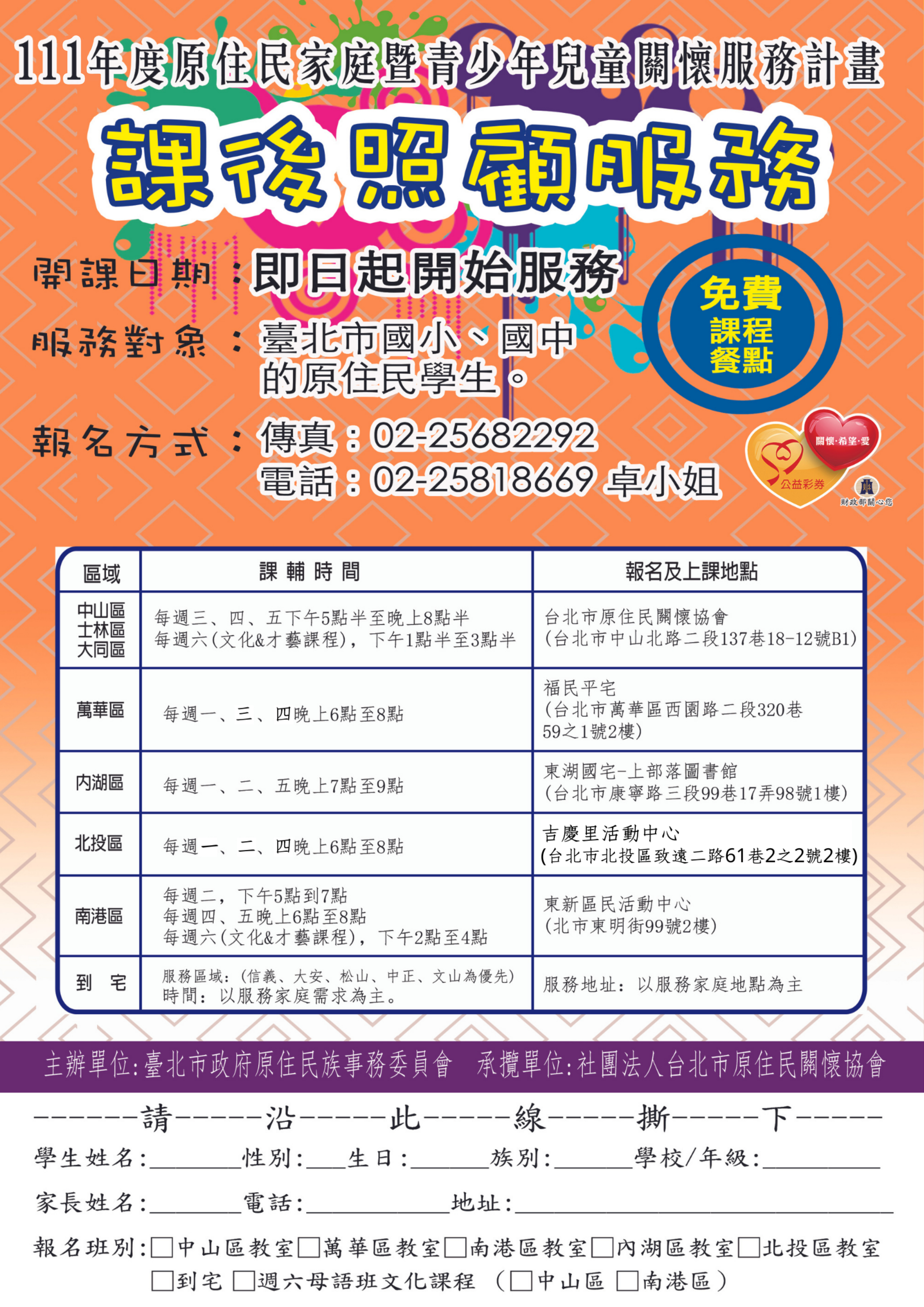 檢送本會委託社團法人台北市原住民關懷協會辦理「111 年原住民家庭暨青少年兒童關懷服務計畫」課後照顧宣傳報名表,惠請協助發送或轉知所轄原住民家戶踴躍報名參
