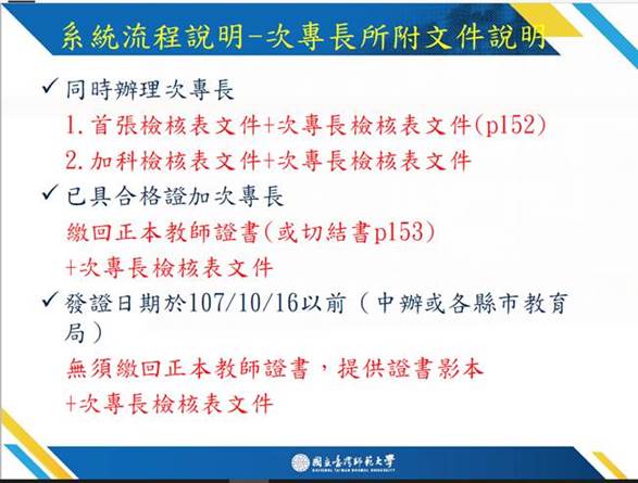 四、檢附臺師大、北市大、國北教認證雙語教學次專長相關資料與程序各1份。