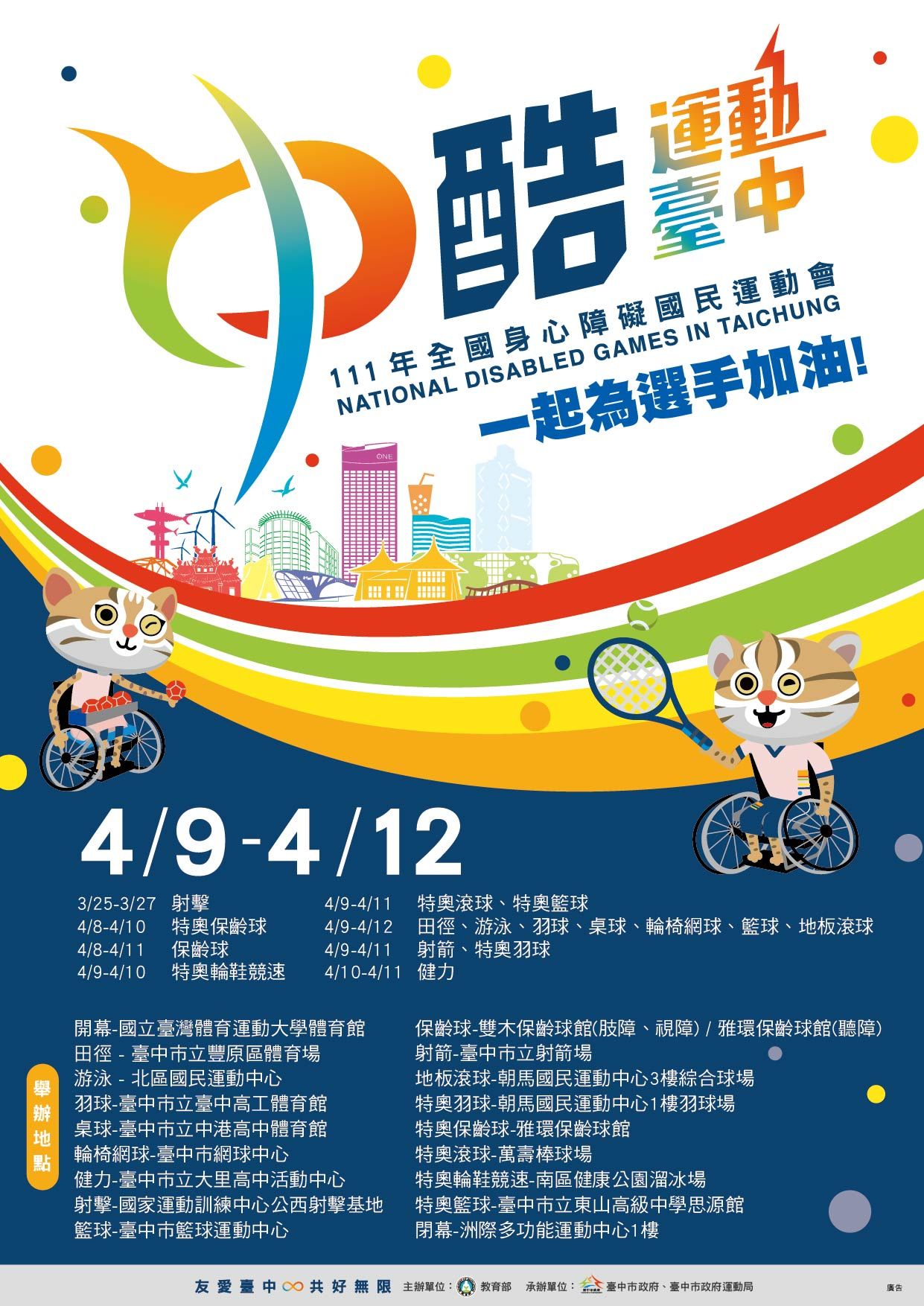 主旨:有關「111年全國身心障礙國民運動會」,請貴校協助宣 傳活動訊息一案,請查照。 說明: 一、依據臺中市政府111年2月22日府授運全字第1110043879號 辦理。 二、旨揭賽事由教育部主辦,臺中市政府承辦,為全國身心障 礙運動最高賽事,並訂於111年4月9日(星期六)起至12日假 臺中市辦理。 三、本市計296選手參賽,比賽項目計16項:田徑、游泳、羽 球、桌球、輪椅網球、健力、射擊、籃球、保齡球、射 箭、地板滾球11項之競技項目;特奧羽球、特奧保齡球、 特奧滾球、特奧輪鞋競速、特奧籃球5項特奧運動項目。 四、檢附大會官網https://111sport.edunets.tw/Module/Home /Index.php及活動海報電子檔1份。