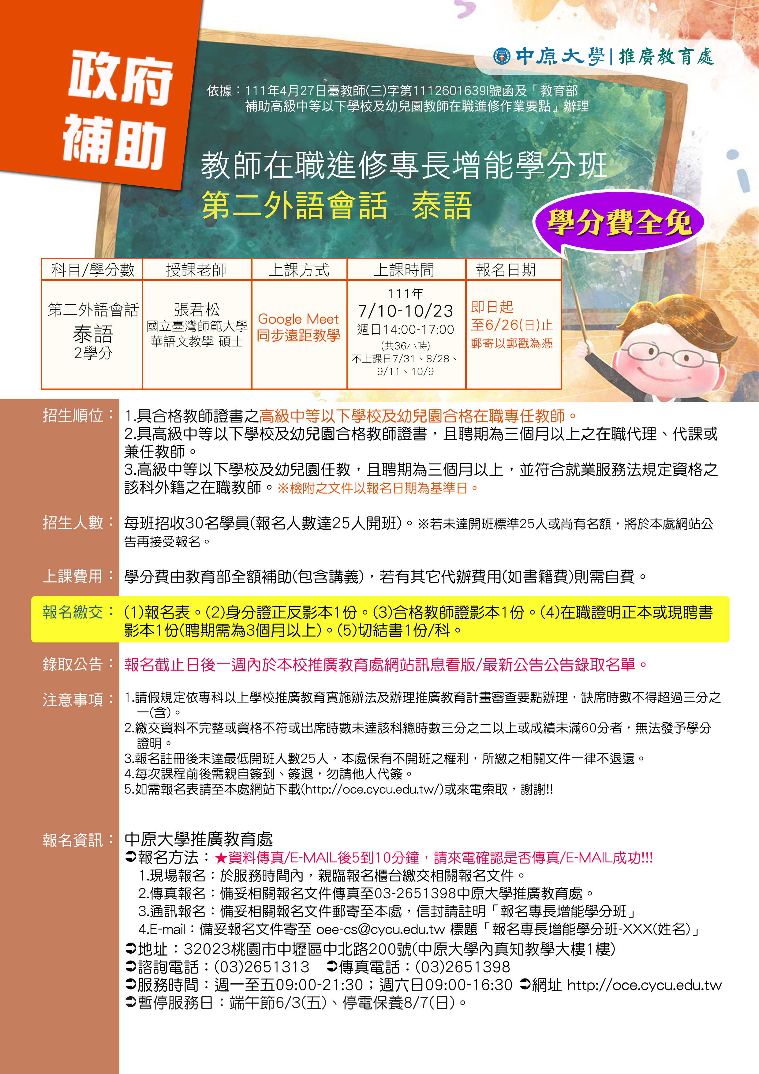 一、「第二外語會話(泰語)」課程之報名截止日為111年6月26 日,限額30名。