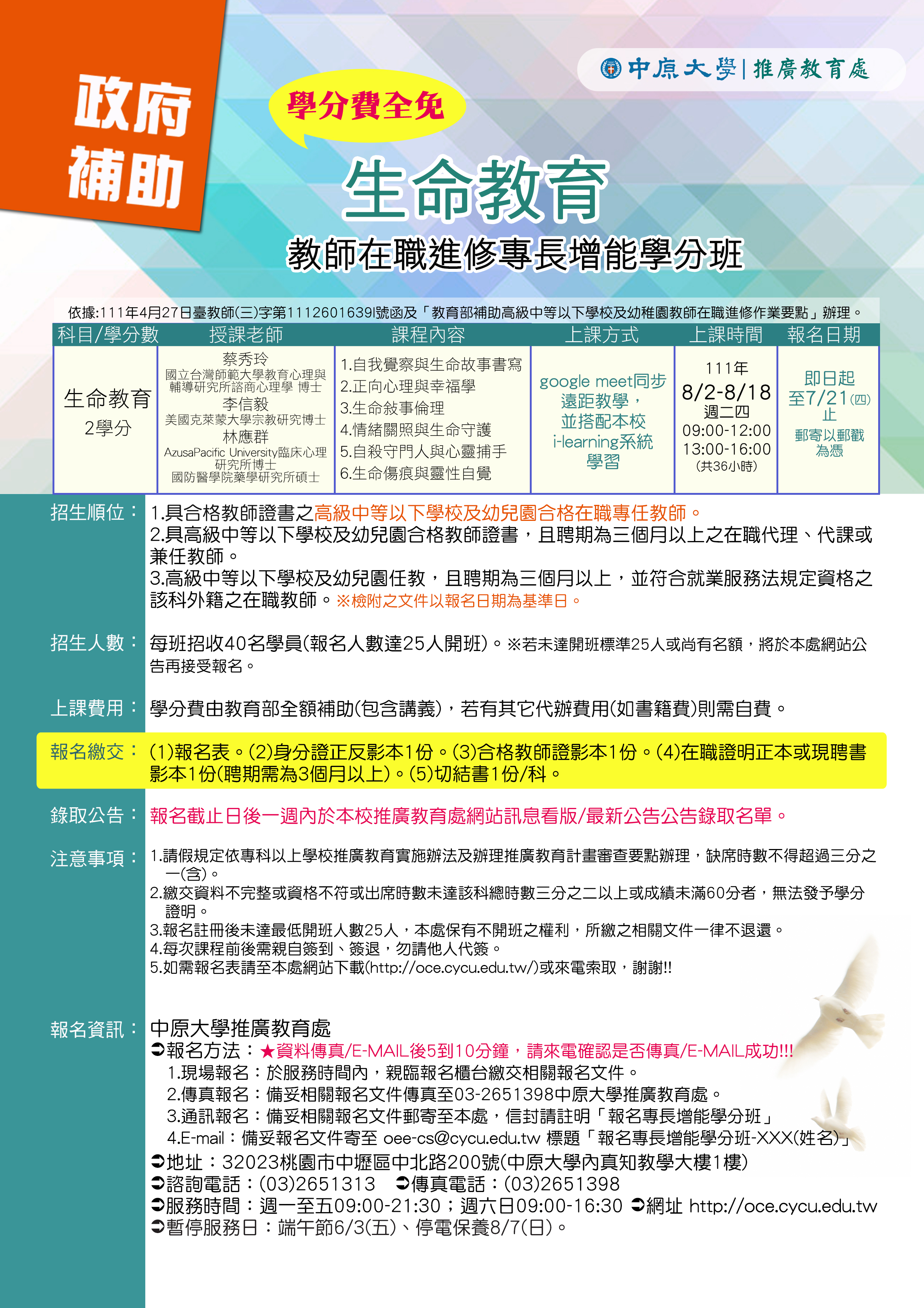 二、「生命教育」課程之報名截止日為111年7月21日,限額40 名。