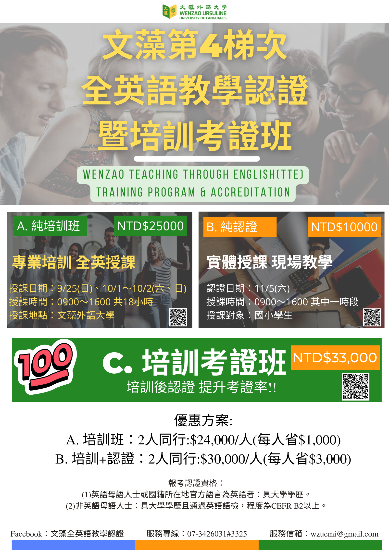 (一)為台灣首創之全英語教學師資認證暨培訓課程(全英語授課)。