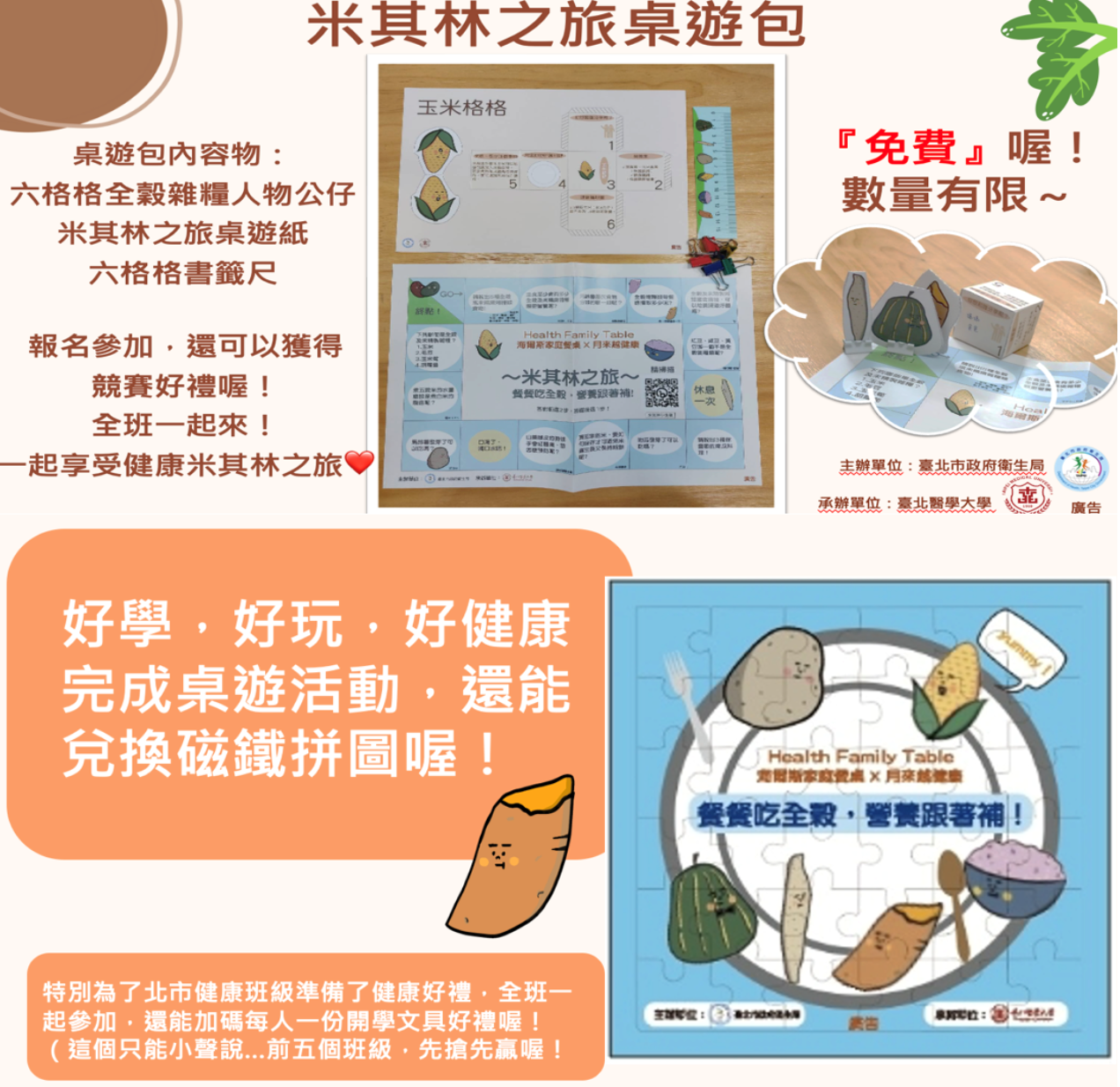 為提升本市學生族群「全穀及未精製雜糧」識能並增加其 攝取量,衛生局於111年委託臺北醫學大學(以下稱該 校)辦理旨揭活動(活動圖卡如附件),並運用衛生福利 部國民健康署與營養師的專業知識,製作「米其林之旅」 桌遊模組,透過寓教於樂方式提升學童對於「全穀及未精 製雜糧」認識並主動增加其攝取。