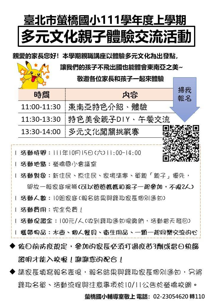 一、螢橋國小辦理多元文化親子體驗交流活動,活動免費採線上報 名,敬請協助公告於校網並周知校內弱勢學童。