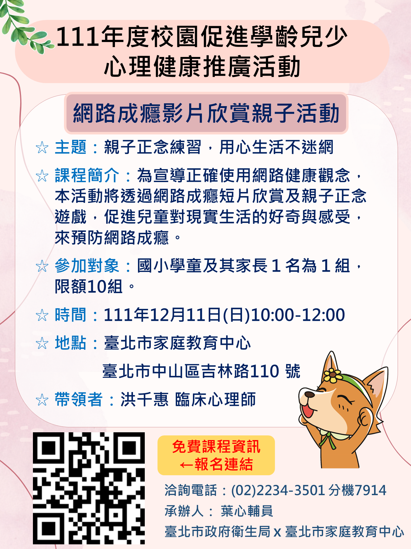 三、課程內容詳如海報簡章,報名注意事項如下: (一)參加對象:本市公私立國小在校學生及家長。 (二)活動日期:111年12月11日(日)上午10時至12時。 (三)活動地點:臺北市家庭教育中心(臺北市中山區吉林路 110 號),惟因應防疫,研習地點若異動將以電子郵件 通知。 (四)研習時數:完整參與課程者,將提供認輔志工研習時數證明。 (五)報名網址:https://mental-health.gov.taipei/(臺北 市社區心理中心官網-報名專區-講座/活動)。 (六)實體課程防疫事項:請參與者佩戴口罩及配合量體溫等 防疫措施,並依座位表入座,如有發燒、咳嗽等症狀, 或於自我健康監測、自主防疫、自主健康管理、居家隔 離、居家照護、居家檢疫期間者,不得入場。 (七)連絡窗口:臺北市社區心理衛生中心(02)2234-3501分機 7914葉心輔員。
