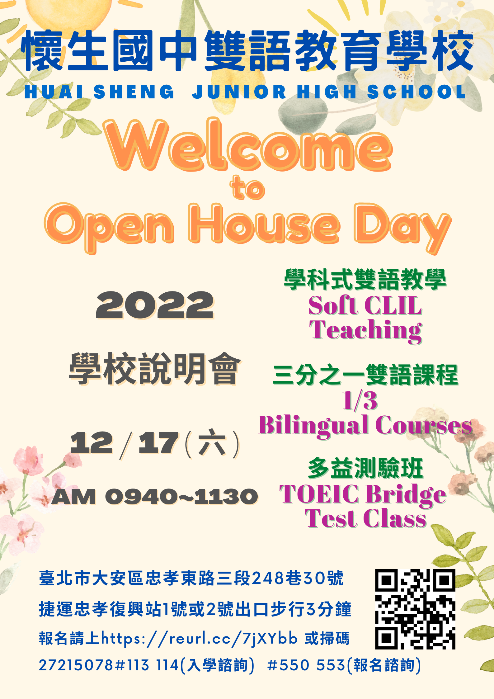 一、本校自109學年度升格為雙語教育學校,辦理校園開放參觀 日(Open House Day),提供國小應屆畢業生及家長,了解 本校辦學理念、各項特色課程及學校教學環境。