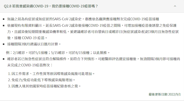 3.依據疾管局公告,建議確診者可自發病日或確診日(無症狀感染者)起3個月且無急性症狀後,接種 COVID-19 疫苗。