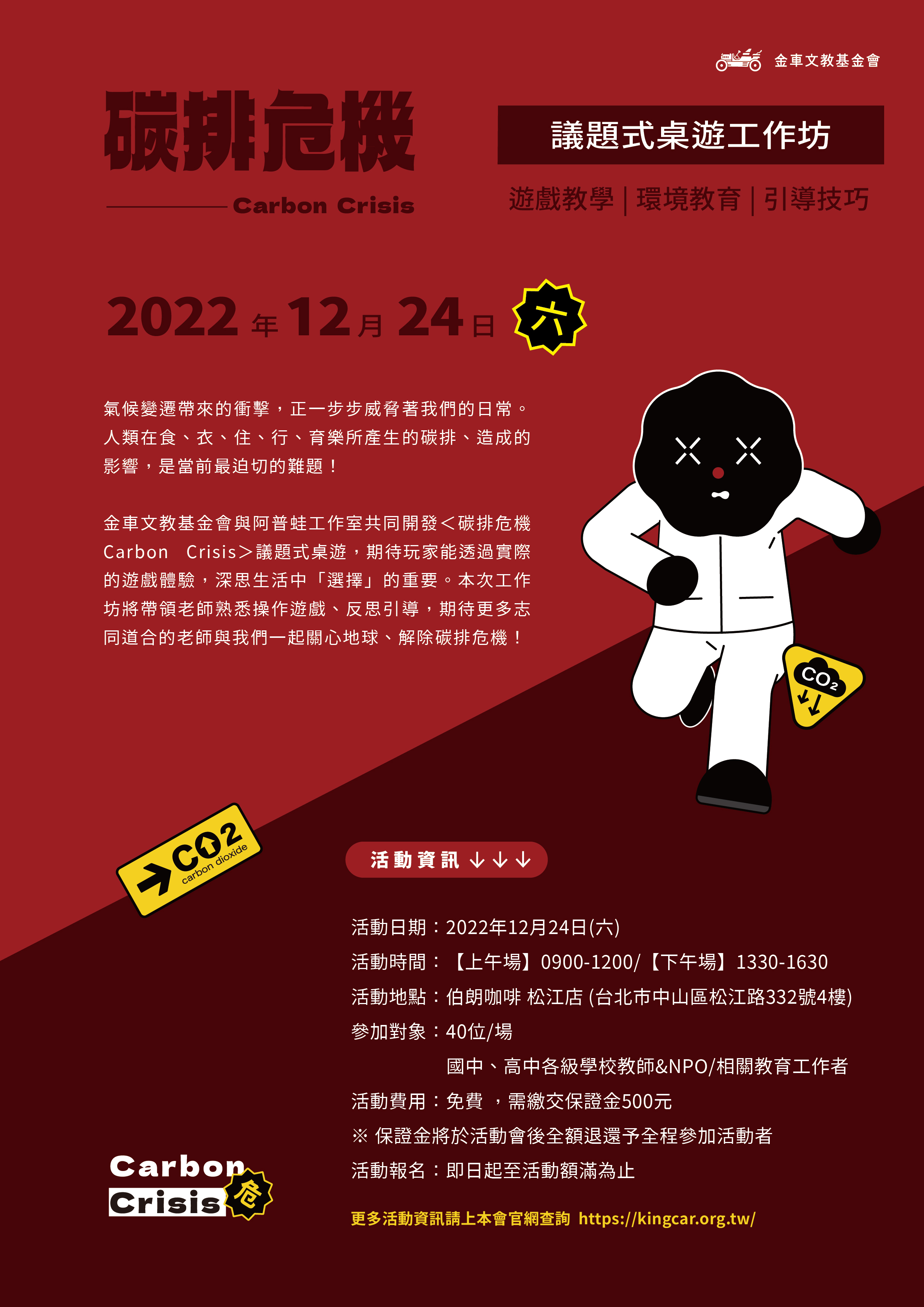 二、活動資訊 活動日期:2022年12月24日 (六) 活動時間:上午場09:00-12:00/下午場13:30-16:30 活動地點:伯朗咖啡松江店(台北市中山區松江路332號4樓) 活動對象:國小至高中學校教師,提供2.5小時研習時數 活動費用:免費(需事先報名及繳交保證金500元) 報名日期:即日起至活動額滿為止 活動詳情請上:kingcar.org.tw 》我要報名》議題式桌遊工作坊