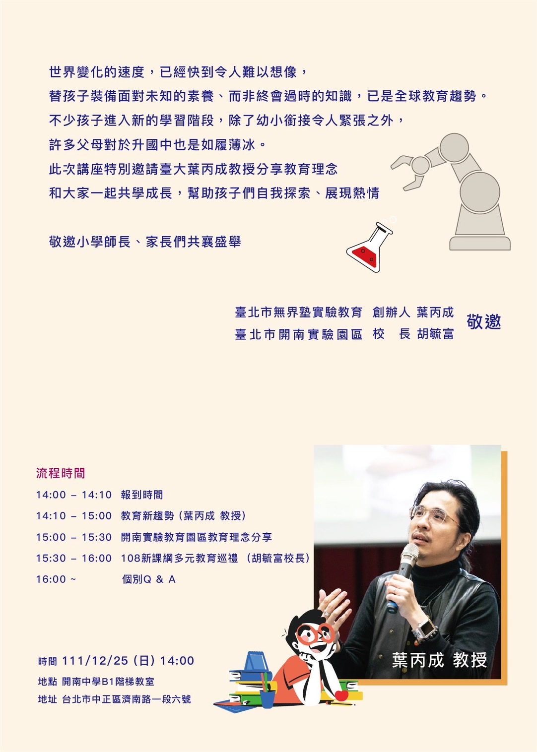 一、為使國小師生及家長更了解教育新方針,本校於111年12月 25日(星期日)下午2:00~4:00辦理新時代新趨勢講座,隨函 檢送「講座邀請函」,特邀貴校師長、即將升國中的學生 與家長們蒞校參加,敬盼 協助公告於學校官網。