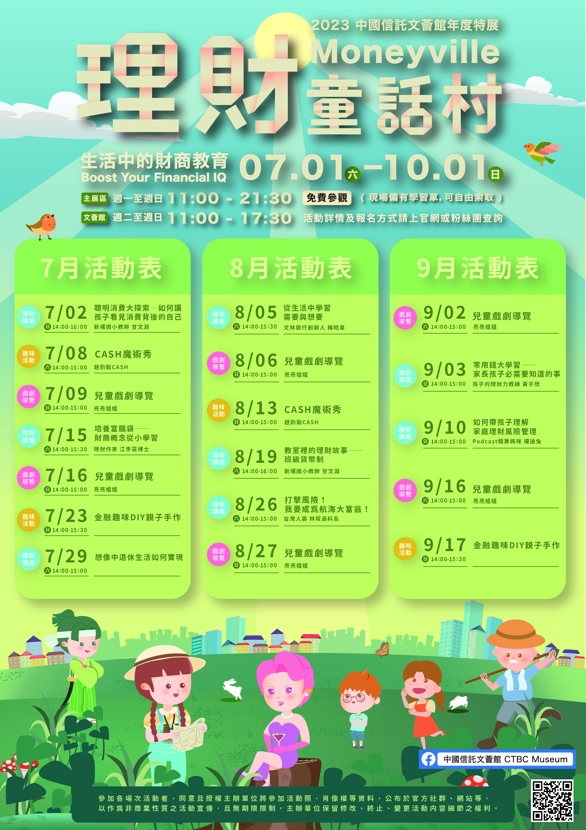 三、特展相關資訊(一)展覽時間:【特展區】112年7月1日至10月1日,每日11 時至21時30分;【文薈館展區】全年每週二至週日11時 至17時30分(週一及農曆除夕至初二休館)。 (二)展覽地點:中國信託金融園區文薈館(臺北市南港區經 貿二路168號A棟1樓)。 (三)特展簡介:打造繪本故事風格的展場,探討生活中可能 會遇到的金融問題及應該如何因應。展區依「存款與緊 急預備金、錢從哪裡來?認識金融機構」、「目標儲蓄 與消費、需要與想要、記帳」、「支付方式、投資理財 與風險」、「比價節流、借貸、斜槓開源」、「生活中 必要的保險」等五個主題,切入貼近生活的財商觀念, 以簡單有趣互動探索及闖關學習單,引導思考學習財商 小常識、理財觀念。凡於特展期間完成指定任務者,不 只可獲得限定精美小禮,還有機會抽中Switch大獎。 (四)鼓勵貴校教師搭配本市前文教視字第1123040239號函, 112年度高級中等以下學校金融基礎教育體驗計畫(如附 件)申請,提供學生金融體驗教育參考。 四、倘有疑義,請洽本市麗山國小陳慧儒主任,電話:02- 26574158分機311。