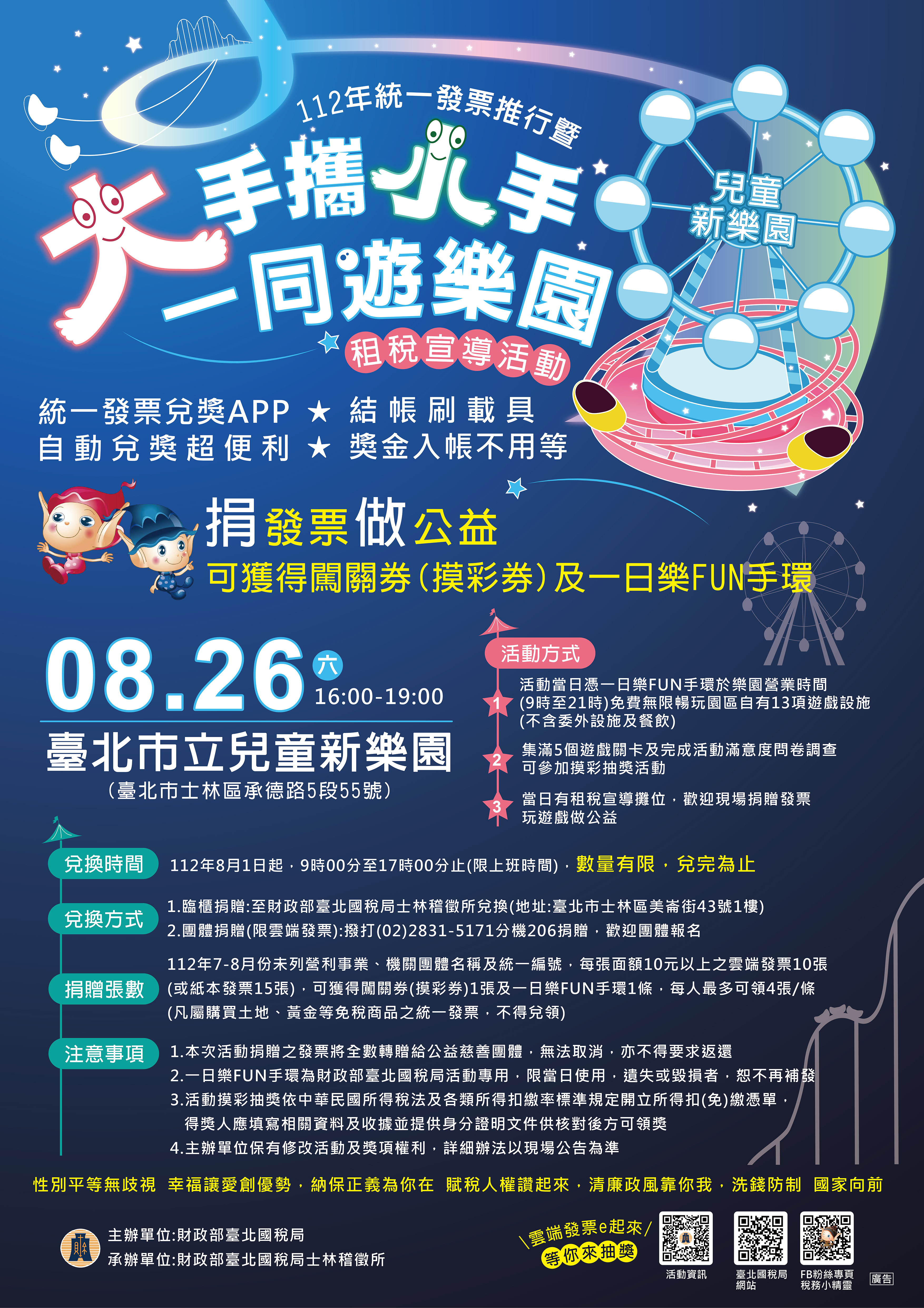 一、依據財政部賦稅署112年3月1日臺稅稽徵字第11204500441號函核定本局「112年度結合統一發票推行辦理地區性租稅教育及宣導執行計畫」序號:15、統一發票推行暨「大手攜小手,一同遊樂園」租稅宣導活動辦理。