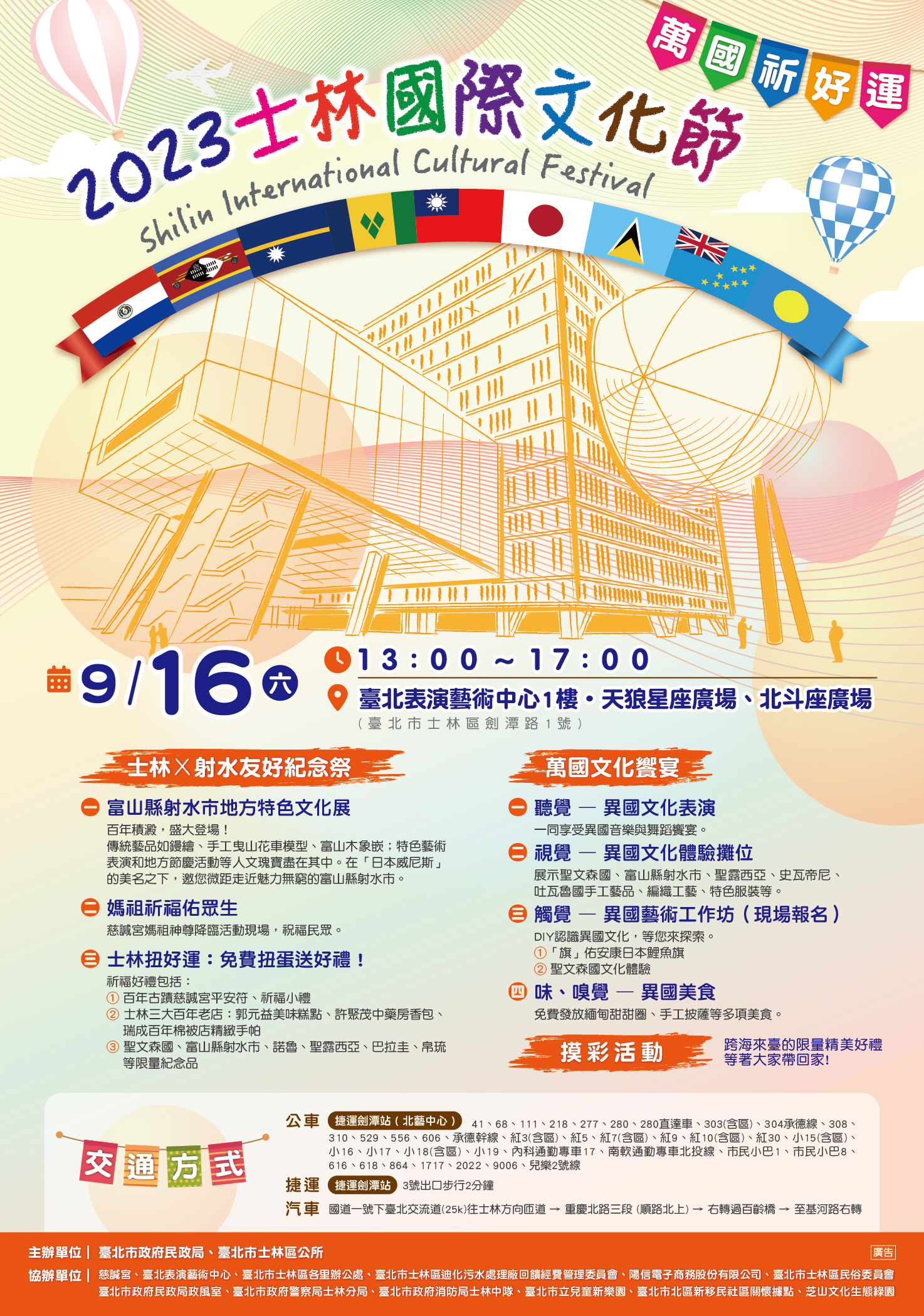 二、網站及粉絲團宣傳文稿如下: (一)標題:文化狂歡趴:「2023士林國際文化節」在北藝中心熱鬧登場! (二)內容::「2023士林國際文化節—萬國祈好運」9/16(六)13時至17時在臺北表演藝術中心登場,活動免費參加!富山縣射水市地方特色文化展、免費扭蛋、異國表演、美食、工作坊及摸彩大獎等著您!詳情上士林區公所網站。