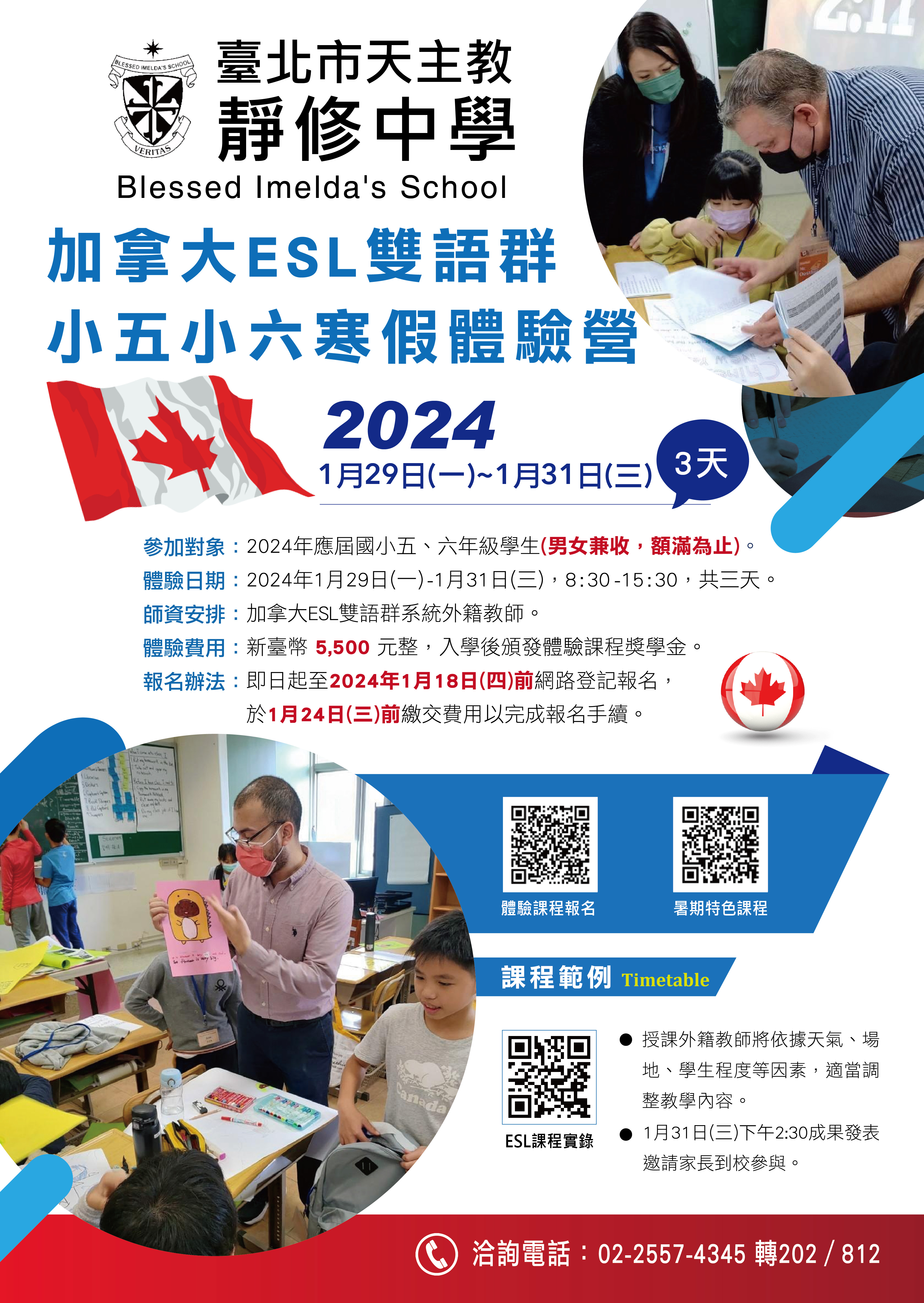 (二) 六年級加拿大ESL雙語課程體驗(限80人,額滿為止)課 程體驗時間:112年12月09日(六)上午9:20-11:20 (三) 學力競試:113年03月10日(日)上午9:00-12:00 二、加拿大ESL雙語寒假體驗營時間:113年1月29日(一)至1月 31日